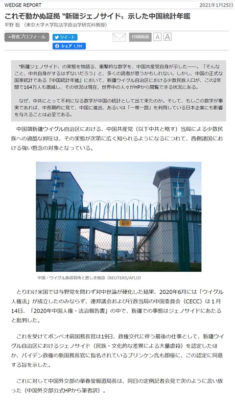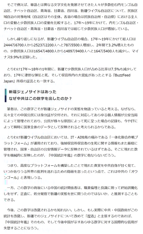 WEDGEによれば、中国で最も権威のある「中国統計年鑑」では、2017~2019年にかけて新疆ウイグル自治区のウィグル族など先住民族人口は1654万4800人から1489万9400人へと164万5000人も激減しており、特に2017年~2018年の1年間の比率は7.5%も減少しているという。これは、2017年の凄惨な弾圧と収容所内の大混乱があったとする『BuzzFeed Japan』所収の証言と一致するそうだ。