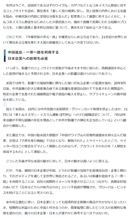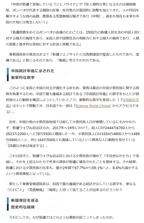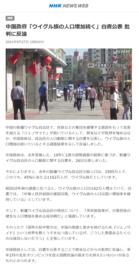 そして、新疆ウイグル自治区の現状について、「多民族国家が、少数民族の健全な人口増加を進める成功例だ」と強調しています。