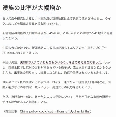 ウィグル人女性に対する「人工避妊手術の強制」や「漢民族男性との強制結婚」などが報じられており、少し考えれば「漢民族男性との子どもをウィグル人と数えた」等の数字のカラクリがいくつも考えられる筈・・・・・
