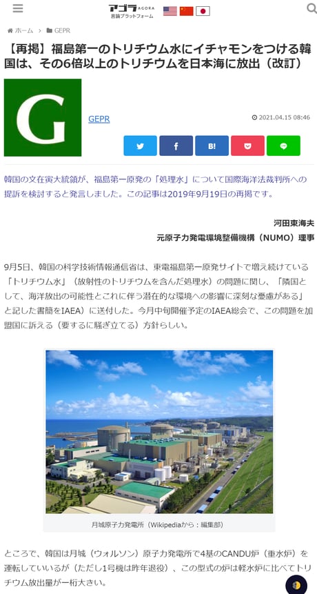 共同通信が取材した「国連特別報告者」は、日本の処理水よりトリチウム量が多い全世界の原発施設を「即時閉鎖せよ」と主張しているのか?