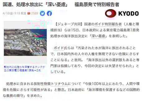 【ジュネーブ共同】国連のボイド特別報告者(人権と環境担当)らは15日、日本政府による東京電力福島第1原発処理水の海洋放出決定に「深い憂慮」を表明した。
