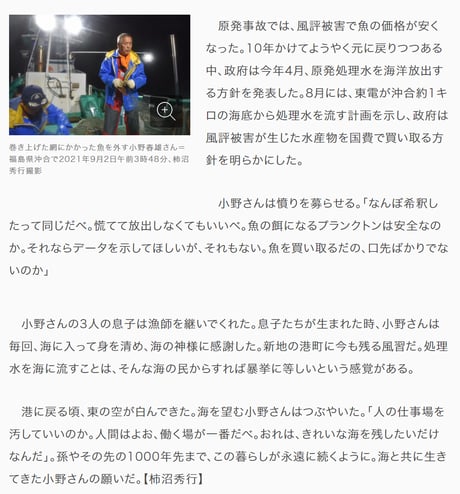 小野さんは憤りを募らせる。「なんぼ希釈したって同じだべ。慌てて放出しなくてもいいべ。魚の餌になるプランクトンは安全なのか。それならデータを示してほしいが、それもない。魚を買い取るだの、口先ばかりでないのか」