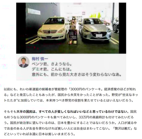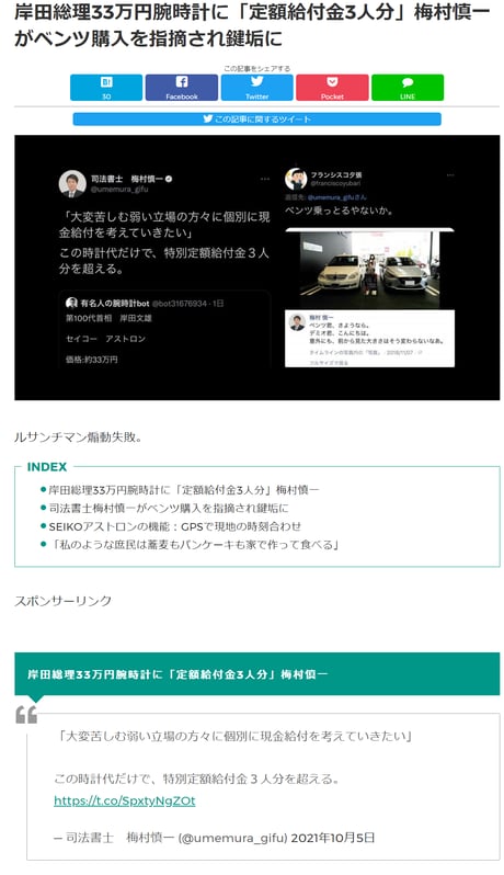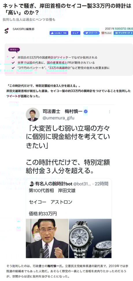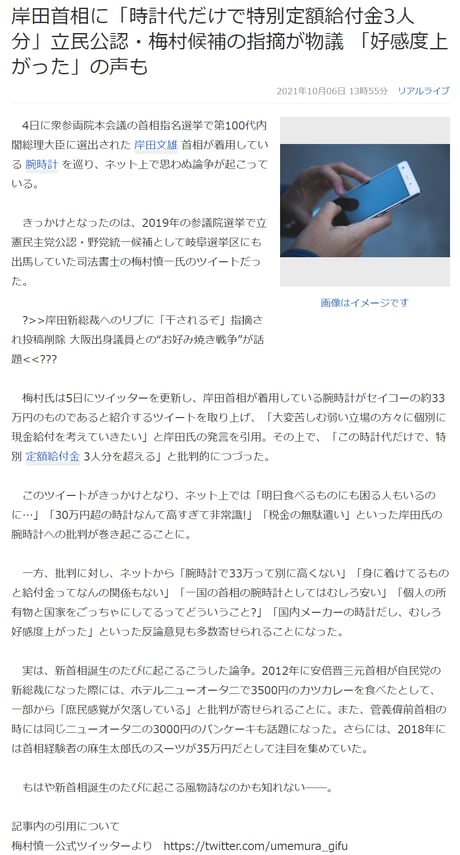 この記事の汚いところは、最初に岸田総理の時計避難投稿をしたのが2019年に立憲民主党から参議院選挙の岐阜県選挙区に立候補した司法書士・梅村慎一氏だということを隠していること。「有権者は庶民感覚に敏感」なのではなく、「ベンツに乗っていた野党候補者が私費で購入した30万円の時計を『高価』だと誹謗中傷している」のが正しい。