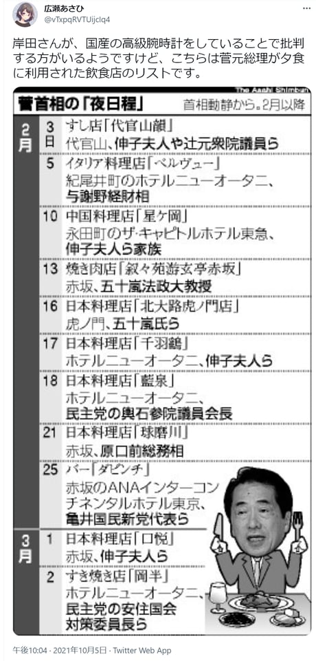 「安倍元首相が3500円のカツカレーを食べただの、菅前首相が3000円のパンケーキを食べただの、有権者は政治家の庶民感覚に敏感」なら、悪夢の民主党政権の菅直人元総理のときは「庶民感覚が麻痺」していたのかな?