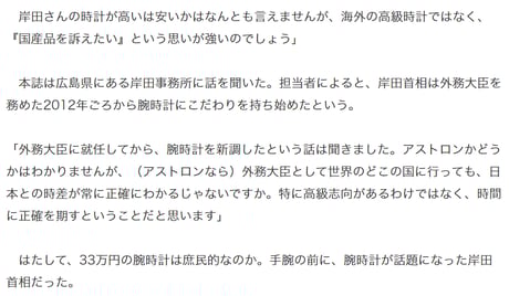 岸田さんの時計が高いは安いかはなんとも言えませんが、海外の高級時計ではなく、『国産品を訴えたい』という思いが強いのでしょう」
