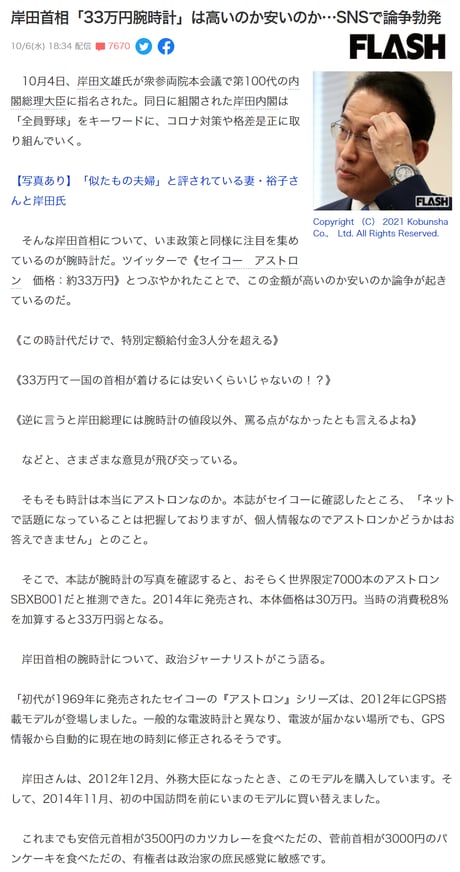 そんな岸田首相について、いま政策と同様に注目を集めているのが腕時計だ。ツイッターで《セイコー アストロン 価格:約33万円》とつぶやかれたことで、この金額が高いのか安いのか論争が起きているのだ。