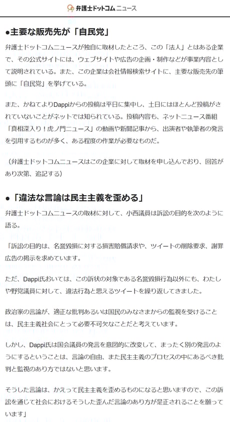 ※ 「また、小西議員は以前、ツイッターで、Dappiとは別のアカウントから「殺害予告」を受けたことがあるという。」と、あたかもDappiが「殺人予告」と関連があるかのような印象操作を行なう悪質な記事ですね。