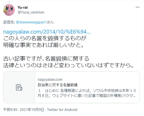 ・これ可能なら左派のアカウントで安倍さんの悪口言いまくってた連中は軒並み名誉毀損で訴えられられるな。