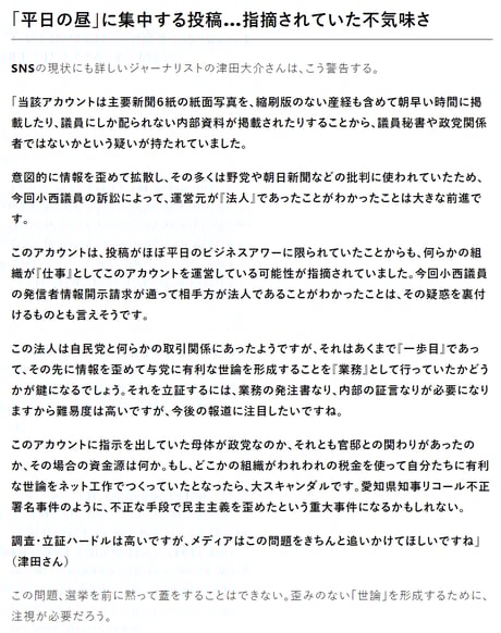 このアカウントは、投稿がほぼ平日のビジネスアワーに限られていたことからも、何らかの組織が『仕事』としてこのアカウントを運営している可能性が指摘されていました。今回小西議員の発信者情報開示請求が通って相手方が法人であることがわかったことは、その疑惑を裏付けるものとも言えそうです。