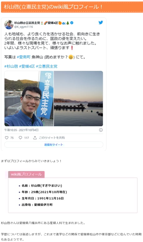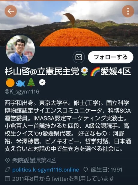 立憲民主党の杉山啓氏のtwitterプロフィールはρ(・・。) コレ