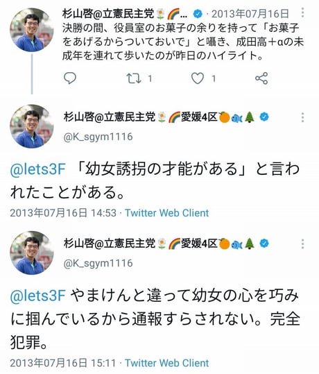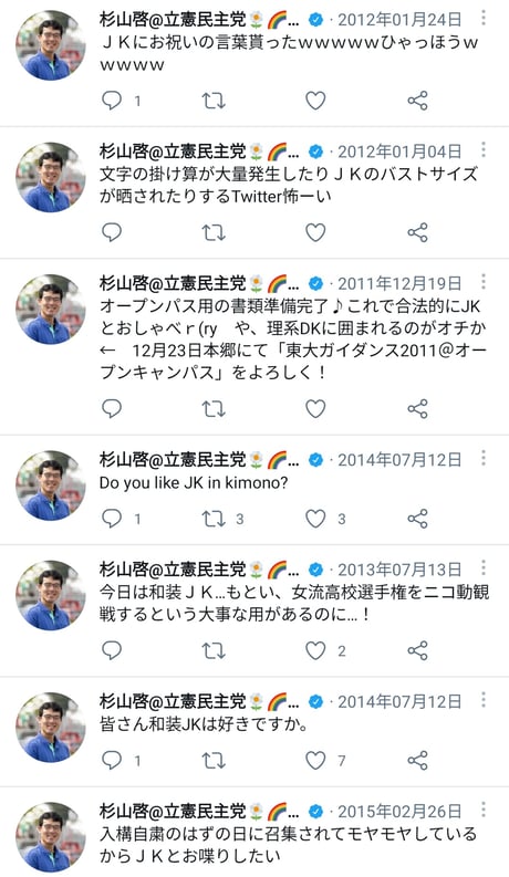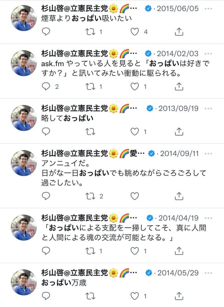 立憲民主党の杉山啓衆院議員のツイートが変質者で完全にアウトであるとネットで炎上中です。