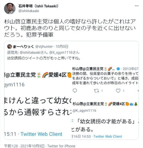 菅前首相が退陣を表明した9月以降、立憲民主党は、「森かけ桜の情報公開」など、一般人からすればどうでもよい政治公約ばかりを発表し、政党支持率がどんどん低下していますが、杉山氏のこの変質者なツイートが世間に明らかになると、ますます立憲の支持率は低下してしまうのではないでしょうか?