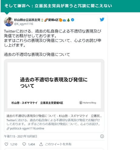 「女性の力を頼りにしている」という森元総理の発言を切り取り「女性蔑視発言」と報じ、マスコミ総出で闘病しながら無償でオリンピックに尽くしてきた後期高齢者を叩いたのと比べると、立憲民主党の愛媛県第4区総支部長を務める杉山啓氏の過去のtweetについての報道内容は大人しすぎないだろうか?