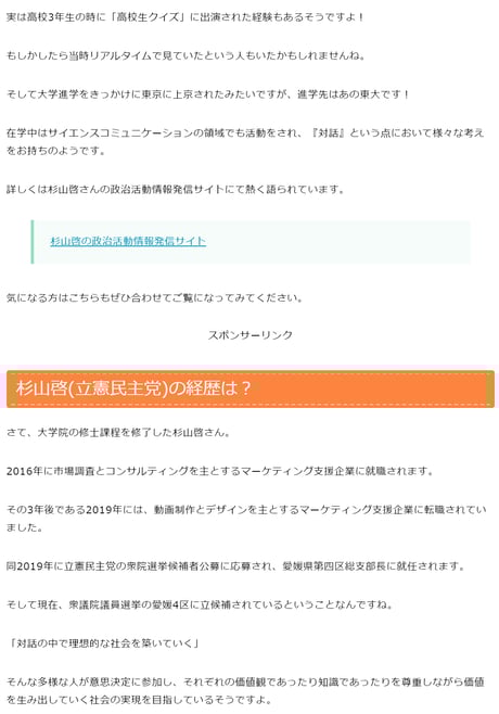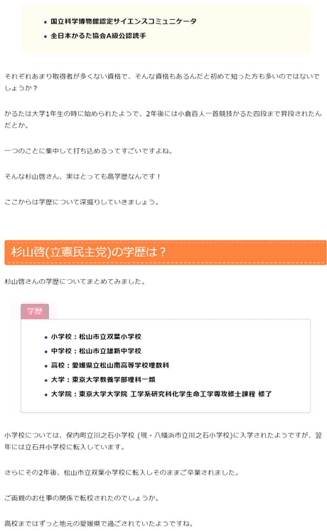 立憲民主党サイトによると、杉山啓氏は愛媛4区の衆議院議員であるそうで、東京大学大学院 工学系研究科化学生命工学専攻修士課程修了という相当なインテリのエリートであるようです。