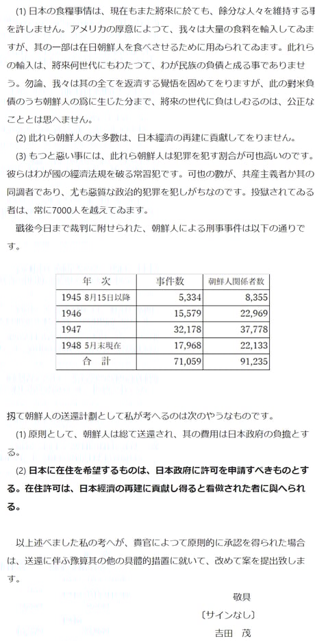 「總數約100萬人、其のほぼ半數は不法入國者であるところの在日朝鮮人」と明記されている。全ての資料に目を通すことが可能である占領軍総司令官に、虚偽を並べ立てて要請など出来るだろうか?