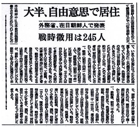 在日朝鮮人の北朝鮮帰還をめぐって韓国側などで「在日朝鮮人の大半は戦時中に日本政府が強制労働をさせるためにつれてきたもので、いまでは不要になったため送還するのだ」との趣旨の中傷を行っているのに対し、外務省はこのほど「在日朝鮮人の引揚に関するいきさつ」について発表した。これによれば在日朝鮮人の総数は約六十一万人だが、このうち戦時中に徴用労務者として日本に来た者は二百四十五人にすぎないとされている。主な内容は次の通り。