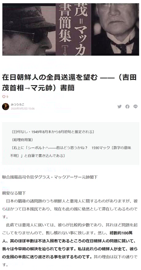 「強制連行の嘘」と「吉田茂書簡」
