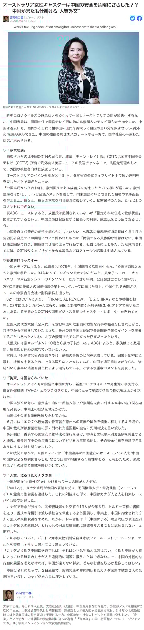 ※ 中国に出張する社員と中国進出企業は「中国共産党に人質にされた場合は、企業が社員救出に責任を持ち、万が一のことがあれば残された社員の家族に生涯年収や慰謝料を支払い生活の保障をする」という契約を結ぶよう、義務づける法律が必要だと思う。