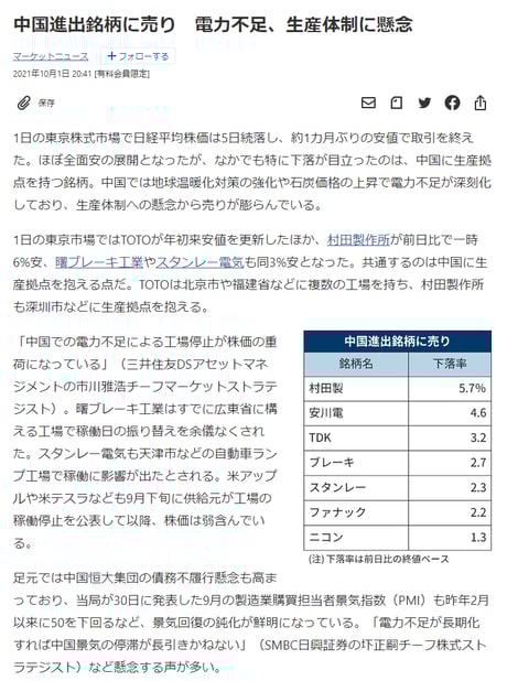 1日の東京株式市場で日経平均株価は5日続落し、約1カ月ぶりの安値で取引を終えた。ほぼ全面安の展開となったが、なかでも特に下落が目立ったのは、中国に生産拠点を持つ銘柄。中国では地球温暖化対策の強化や石炭価格の上昇で電力不足が深刻化しており、生産体制への懸念から売りが膨らんでいる。