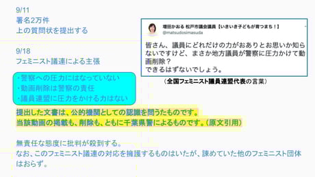 記者会見では、抗議と脅迫を一緒くたにして被害者しぐさ。公開質問状に記載された「性犯罪誘発」にはまったく触れず、「警察が削除した」と責任を他者に擦り付けるフェミ議連。