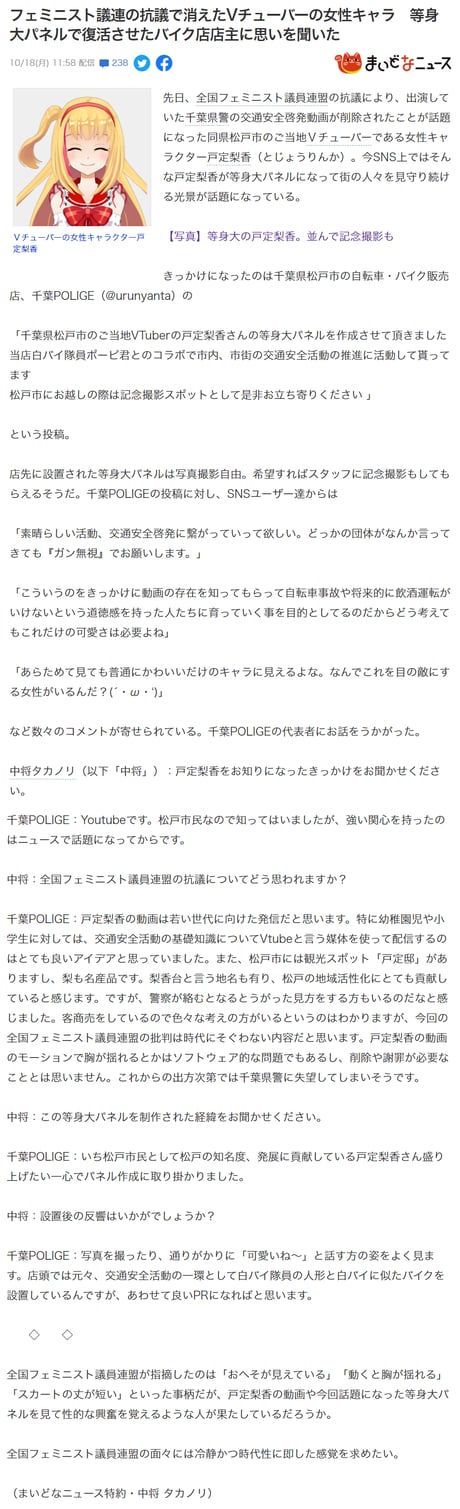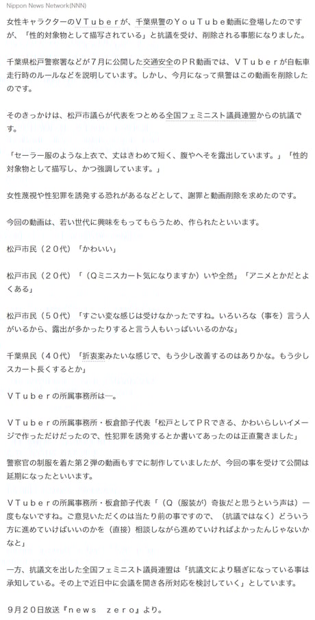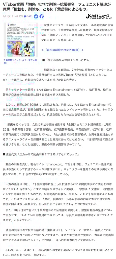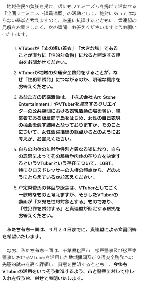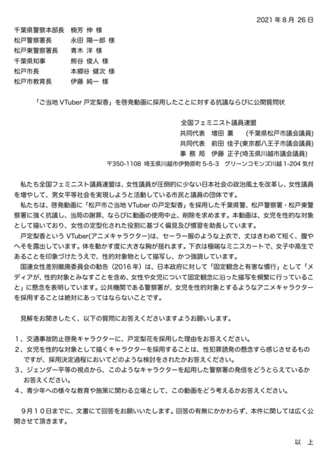 さて、去る8月26日に「全国フェミニスト議員連盟」の共同代表である増田薫氏、前田佳子氏及び事務局の伊藤正子氏によって行われた「「松戸市ご当地VTuberの戸定梨香」を啓発動画に採用したことに対する抗議」について、私たちは強く抗議するとともに、あなた方が行った「抗議」により、VTuberを活用した自治体による啓発動画が削除されたことについて、深い遺憾と憂慮の念を表明いたします。