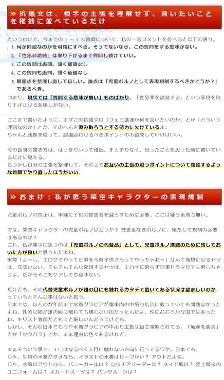 ・最初は「性犯罪を助長」とか偉そうに言ってたのに、都合悪くなったら「子どもに見せられない、慎重になれ」という子ども論法に移行した。本当に卑怯だと思う。