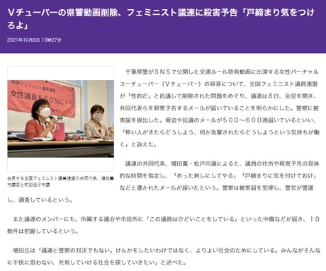 千葉県警がSNSで公開した交通ルール啓発動画に出演する女性バーチャルユーチューバー(Vチューバー)の容姿について、全国フェミニスト議員連盟が「性的だ」と抗議して削除された問題をめぐり、議連は8日、会見を開き、共同代表らを殺害予告するメールが届いていることを明らかにした。警察に被害届を提出した。脅迫や抗議のメールが500~600通届いているといい、「怖い人がきたらどうしよう、何か攻撃されたらどうしようという気持ちが働く」と訴えた。