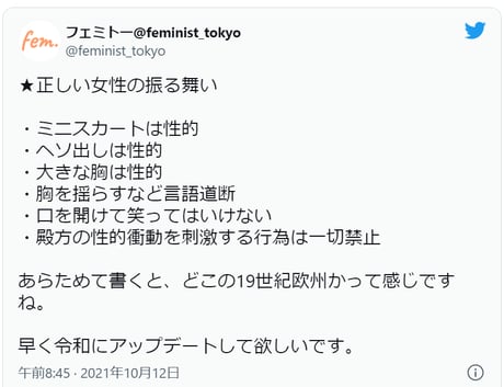 全国フェミニスト議員連盟は代議士という「権力者」の団体である。権力者が「気にくわない表現だから」と一方的に断罪して「表現の自由」を踏みにじり、話し合いにも応じずにSNSから削除させる姿勢は「言論の自由」の弾圧そのもの。「多様性」を認めない姿勢は「リベラル全体主義」と呼ばれるに相応しく、権力者が話し合いを拒否して力尽くで押し通す姿は「暴力至上主義」そのものである。
