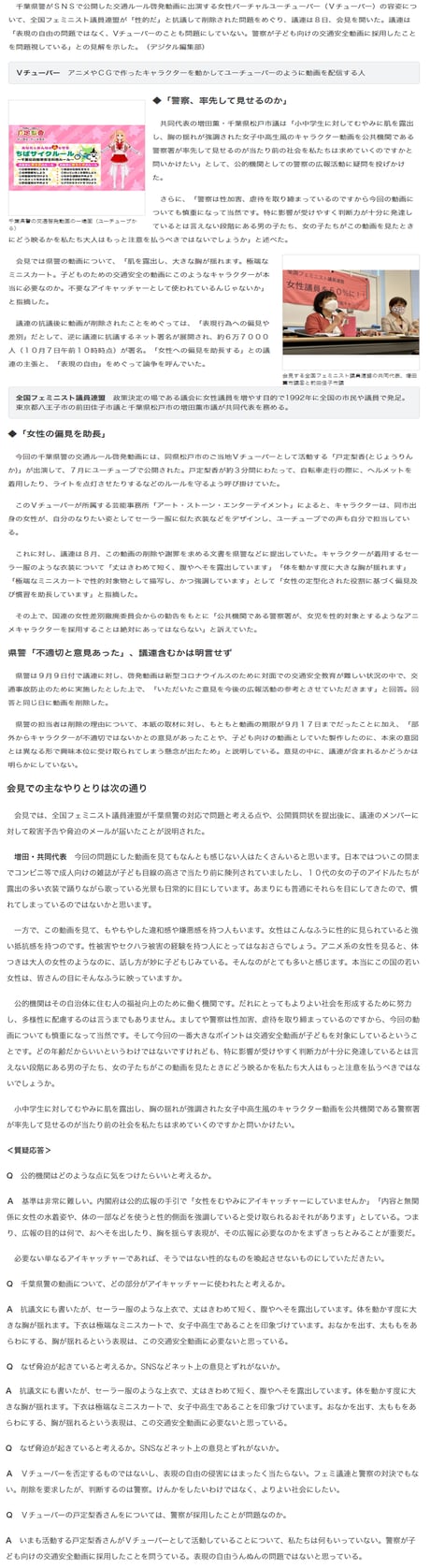千葉県警がSNSで公開した交通ルール啓発動画に出演する女性バーチャルユーチューバー(Vチューバー)の容姿について、全国フェミニスト議員連盟が「性的だ」と抗議して削除された問題をめぐり、議連は8日、会見を開いた。議連は「表現の自由の問題ではなく、Vチューバーのことも問題にしていない。警察が子ども向けの交通安全動画に採用したことを問題視している」との見解を示した。(デジタル編集部)