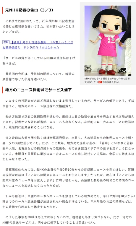 優遇化された組織内天下りが自由に行われていると聞く。また論説委員が数十名もいるそうだが、NHKの社風に染まった論説などもっての外である。論説は一般社会のその道の専門家に依頼した方が良い。