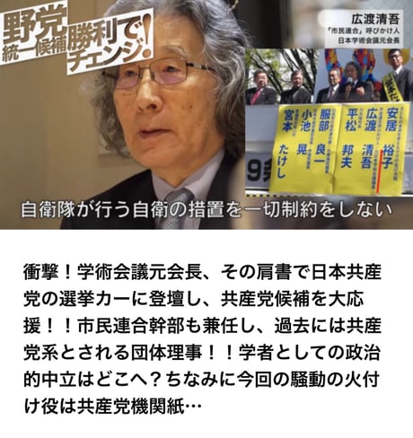 日本学術会議元会長、広渡清吾氏は共産党候補の応援にも駆けつけ登壇。