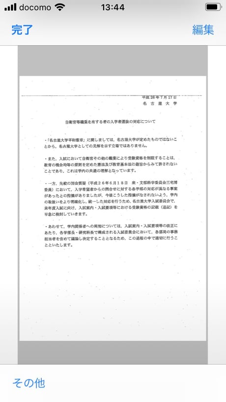 2014年 故三宅博議員の国会質疑を受け名古屋大学学長は自衛官入学拒否を違憲として文書で撤回しました(同封)。