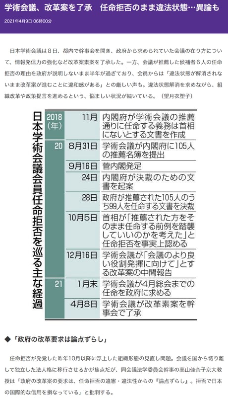 任命拒否が発覚した昨年10月以降に浮上した組織形態の見直し問題。会議を国から切り離して独立した法人格に移行させるかが焦点だが、同会議法学委員会幹事の高山佳奈子京大教授は「政府の改革案の要求は、任命拒否の違憲・違法性からの『論点ずらし』。拒否で日本の国際的な信用を損なっている」と批判する。