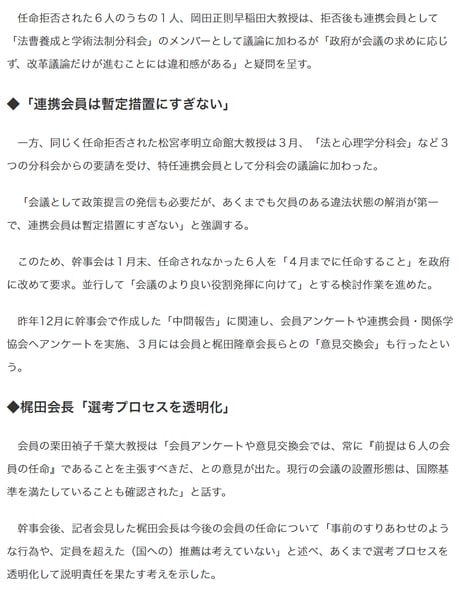 任命拒否された6人のうちの1人、岡田正則早稲田大教授は、拒否後も連携会員として「法曹養成と学術法制分科会」のメンバーとして議論に加わるが「政府が会議の求めに応じず、改革議論だけが進むことには違和感がある」と疑問を呈す。