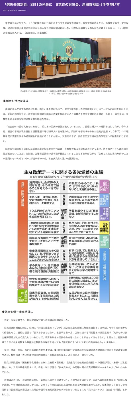 制度の早期実現を公約した立憲民主党の枝野幸男代表は「多様性のある社会を進めていく上で、大きなハードルは夫婦別姓が進まないことだ」と指摘。各種世論調査で過半数が賛成していることなどを挙げながら「なぜこんなに当たり前のことが通用しないんだというのが当事者の声だ」と自民党との違いを強調した。