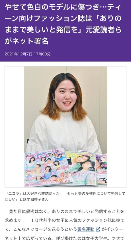 見た目に優劣はなく、ありのままで美しいと発信することを求めます!やせていて肌が白いことが偏重される「画一的な美意識」に多くの子どもたちが傷つけられていることを分かってほしいという。(中村真暁)