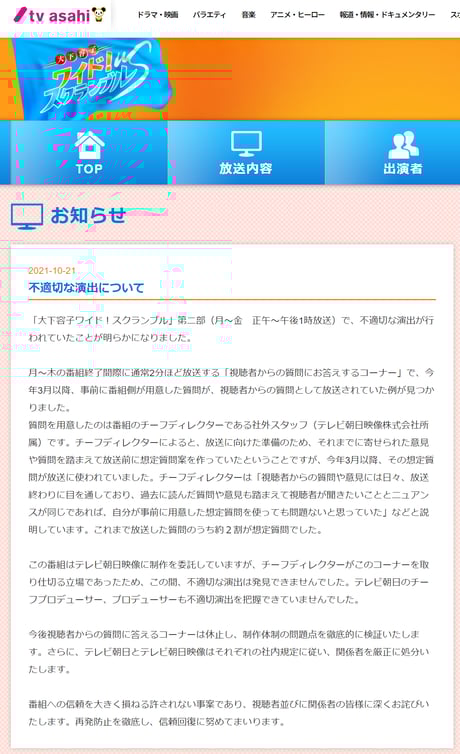テレビ朝日放送に委託されていたといっても、質問はテレビ朝日が募集しているもので責任が軽くなるわけではない。実際に他のスタッフが問題を把握していたからこそ発覚している。テレビ局の不祥事では毎度のごとく「委託していた」とされるが、番組制作の主体はテレビ朝日であり、委託先のせいであるかのような言い逃れは見苦しい。(KLS-Live! 2021.10.21)