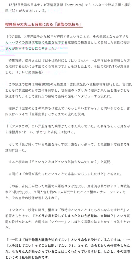 インタビュー映像に戻り、櫻井は「戦時中ということはもちろんなんですけど」と前置きした上で、「アメリカ兵を殺してしまったという感覚は、当時は?」という質問を投げかけるが、吉岡氏は「いや……」としばらく言葉を詰まらせてこう答えたのだ。
