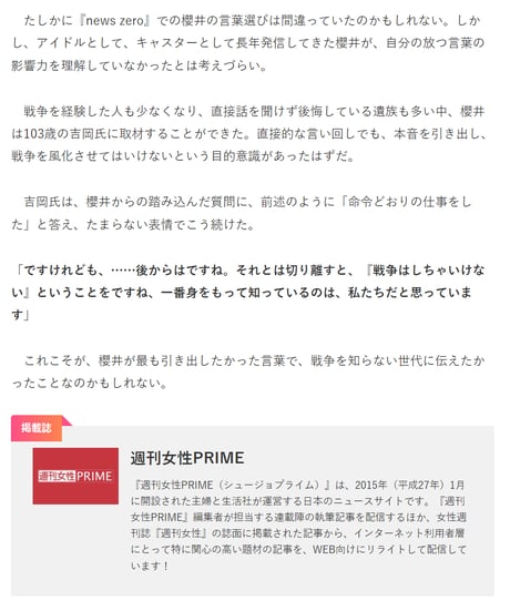 この質問って、櫻井さんが考えたのか、テレビ局の方針としてディレクターあたりに言わされたのか、台本に書いてあったのかは知らんけど、先の大戦で実際に戦場で戦った人にインタビューするなら、まずは相手に対する尊敬や感謝の念があるってことが大前提だと思うのです。