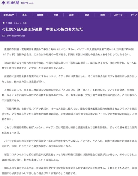 中国の侵略から自国を守るための連携しようとしているのに、「(侵略者である)中国との協力を」などと書ける東京新聞の常識を疑う・・・