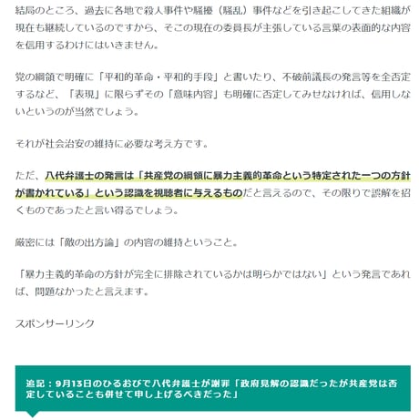 日本国憲法に照らして、「三権分立の停止」や「政府による思想統制」などは、選挙などの民主的方法では実現し得ない。実現するには「暴力革命」や「敗戦革命」しか手段は無いだろう。それを党の綱領に掲げている以上、八代弁護士の『暴力的な革命を党の要綱として廃止していない』という発言は間違ってはいない。(要領は言い間違いだろう・・・・)