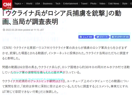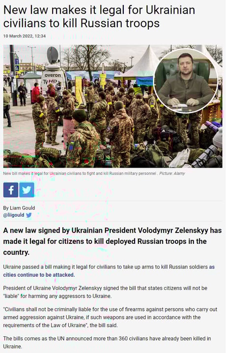 中国共産党の国際法を無視した便衣兵に苦しめられた日本軍によるゲリラ掃討を「民間人虐殺」と喧伝された日本は、「民間人への戦闘への参加」を命じるゼレンスキー大統領が戦争犯罪を犯している事実を指摘する立場にあると思います。