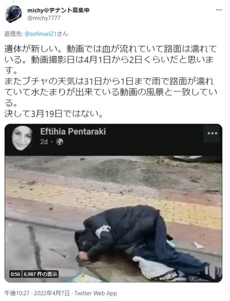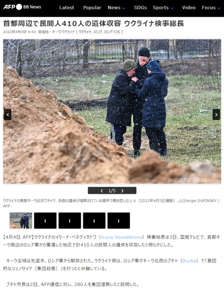 ρ(・・。) こちらの検証では、ロシア軍に虐殺されたとされる死体についての矛盾点を指摘しています
