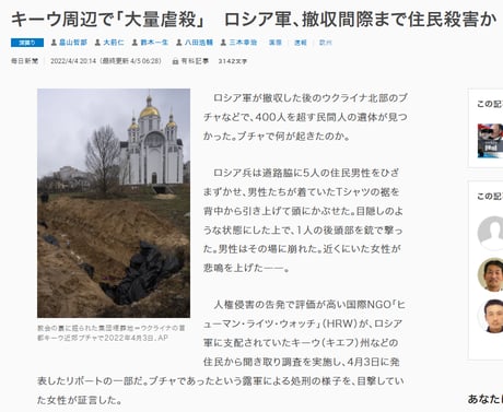 ウクライナ側の主張だけで「ロシア軍による虐殺」を日本が一緒になって批判するなら、我々日本人は「捏造された従軍慰安婦強制連行・性奴隷証言」や「捏造された南京大虐殺」をどう否定すれば良いのでしょう。「第三者による客観的な検証が必要だ」と、日本こそが声を上げるべきではないのでしょうか?