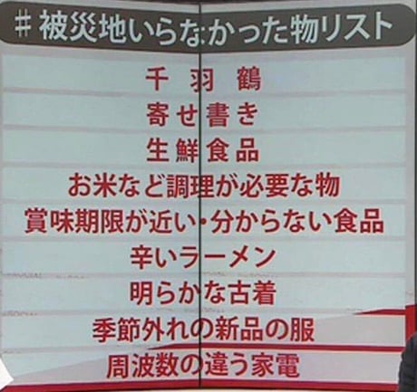 現地に不必要な物を送るのは、偽善どころか害悪。場合によっては、必要な物資の流通を妨げ、結果として助かる命を危険にさらすこともある。究極の「自己満足」を肯定して「平和の大切さ」を視聴者に印象づけるのは、報道機関としての職務放棄に等しい。