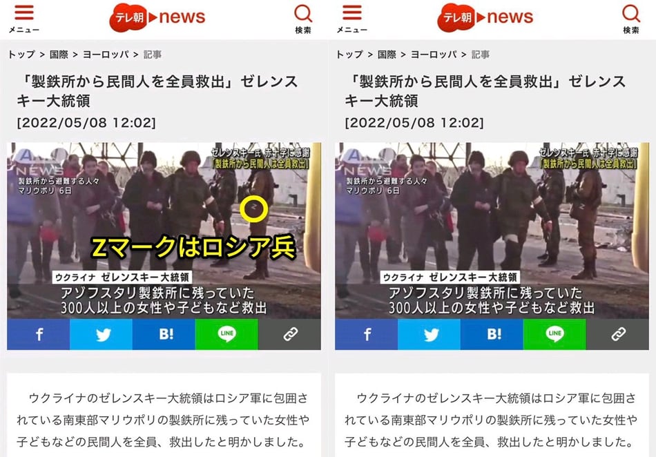 直接は言っていないが「民間人を救出しているのがウクライナ兵」の様に見えるように報道しているテレビ朝日。