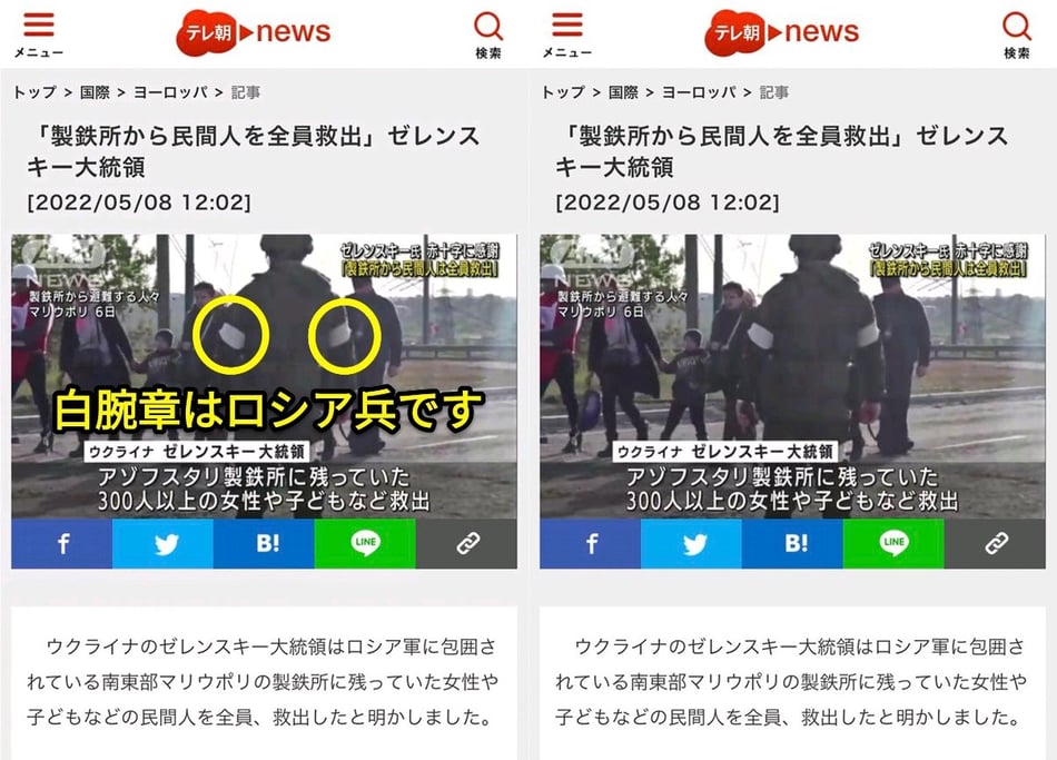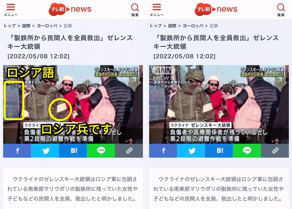 ロシア兵が民間人の脱出を行なっている映像に、「ロシア軍が避難する民間人を攻撃」「メシア軍が避難を妨害」とのテロップを被せている。悪質な情報操作。