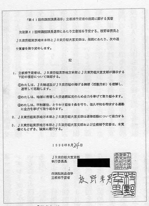 左が、民主党 枝野幸男幹事長とJR東労組 大宮支部 執行委員長との選挙協力の覚書です。