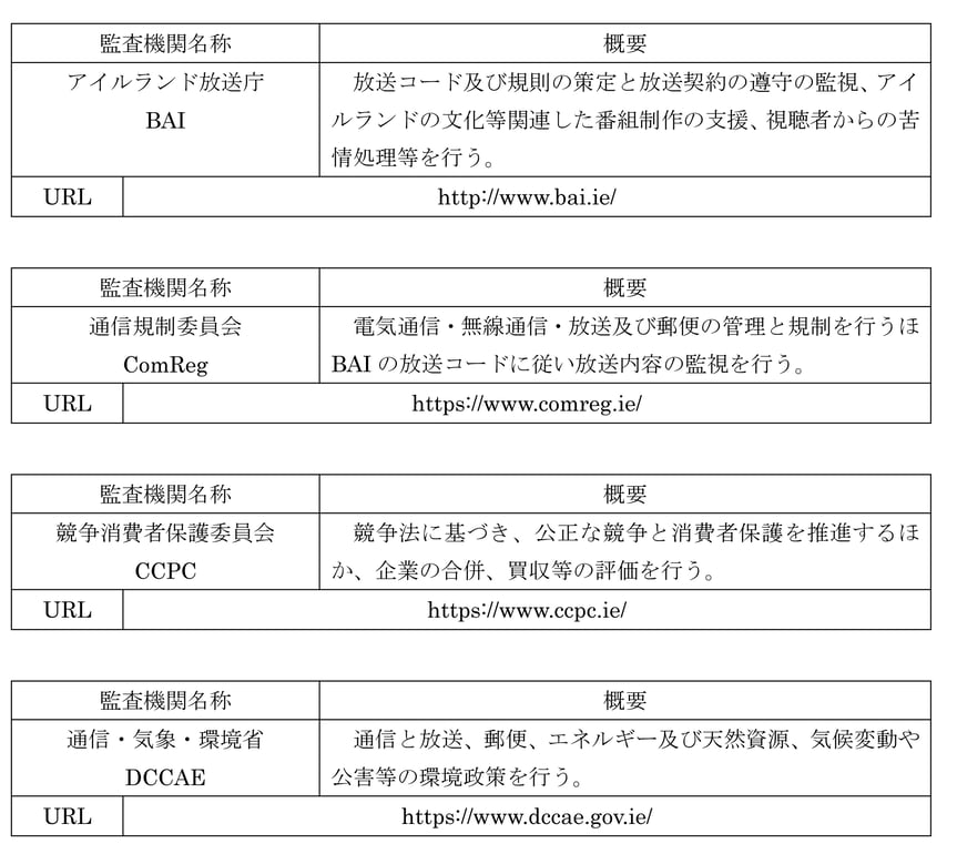 放送に関する法律及び規制の枠組み、通信及び放送・メディア振興のための政策策定、(視聴者に対する)TVライセンス料の徴収等は通信・気象・環境省(Department of Communications,Climate Action & Environment DCCAE)が行い、放送サービスのコンテンツ内容の規制や、放送免許等の管理と、放送コード及びルールの策定、放送の苦情の処理や消費者保護はアイルランド放送庁(BAI)が、放送免許等の新規策定やライセンス条件の監視等は通信規制委員会(ComReg)が、消費者保護全般と公正な競争に関する監視及び規制は競争消費者保護委員会(CCPC) が行う。