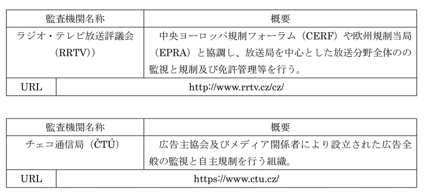 なお、公共放送のチェコ・テレビについては、ラジオ・テレビ放送評議会(RRTV)の監督下にはなく、チェコ・テレビに関する国家評議会の法律に基づき設立された規制団体であるチェコ・テレビ評議会(Rada České televise RadaČT)が、番組計画や放送コードも含むテレビ放送全般の規制監督業務を実施している。